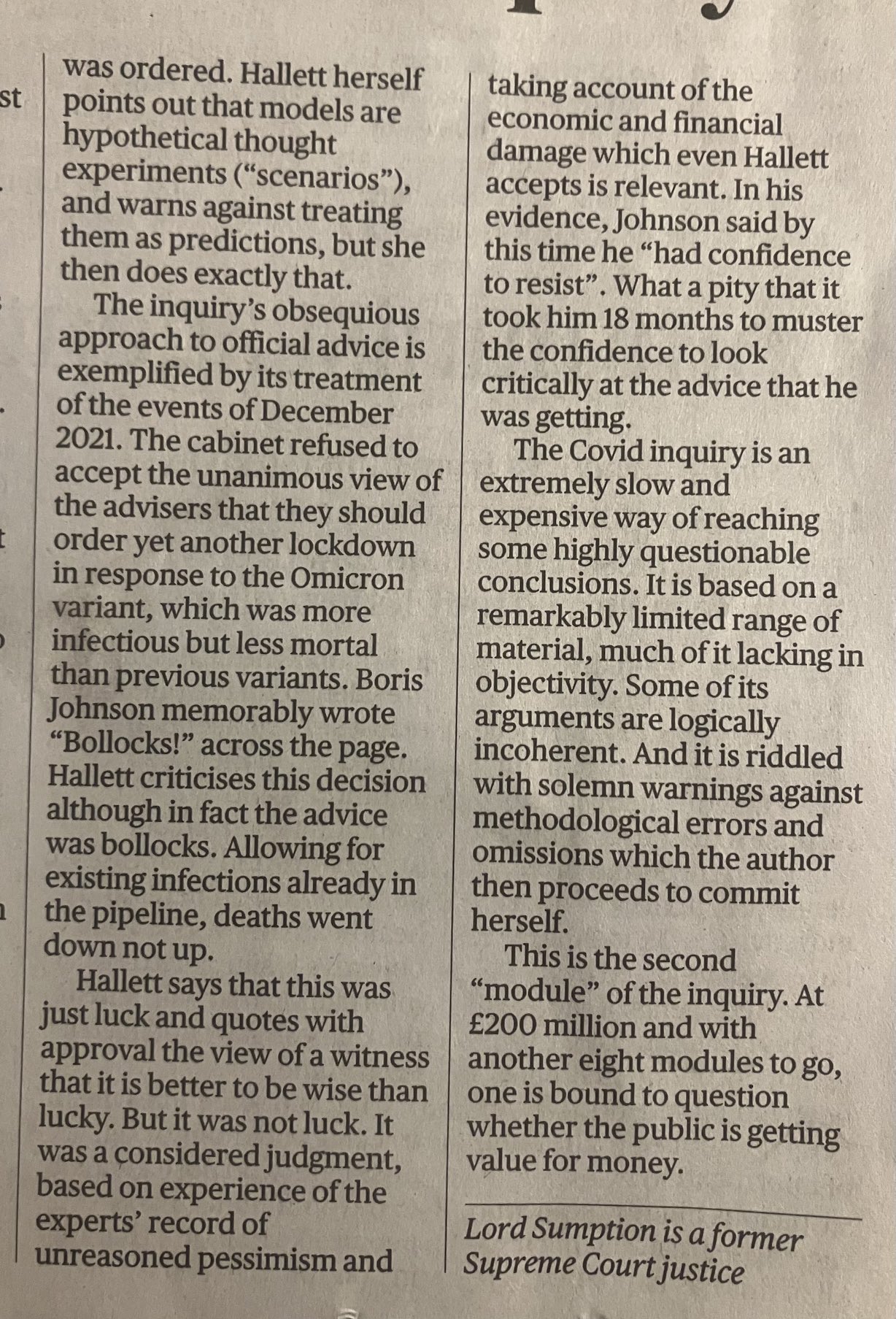 This is the last part of a piece today in the Sunday Times about the stage two Covid inquiry report by former Supreme Court justice Lord Sumption.
