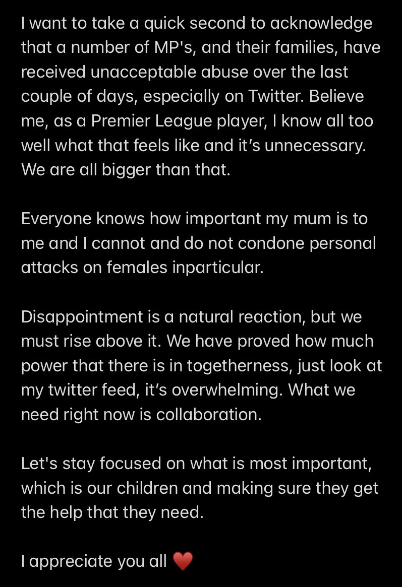 The footballer had posted a statement (below) saying that posting "unacceptable abuse" against people who had different opinions about child poverty and how to address it was not the way to help hungry children.
