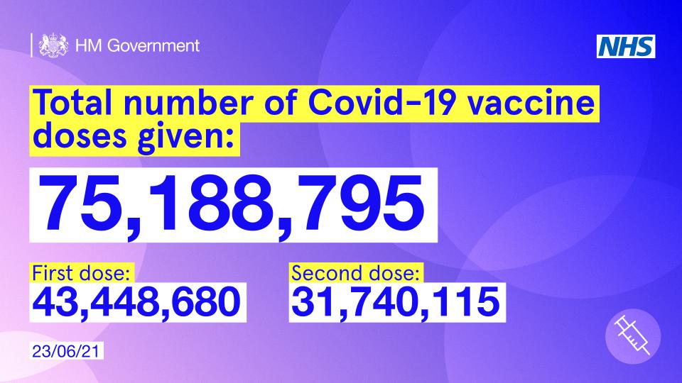 More than 75 million doses of approved COVID-19 vaccinations have now been given in the UK. And three our of five adults have now had both jabs.