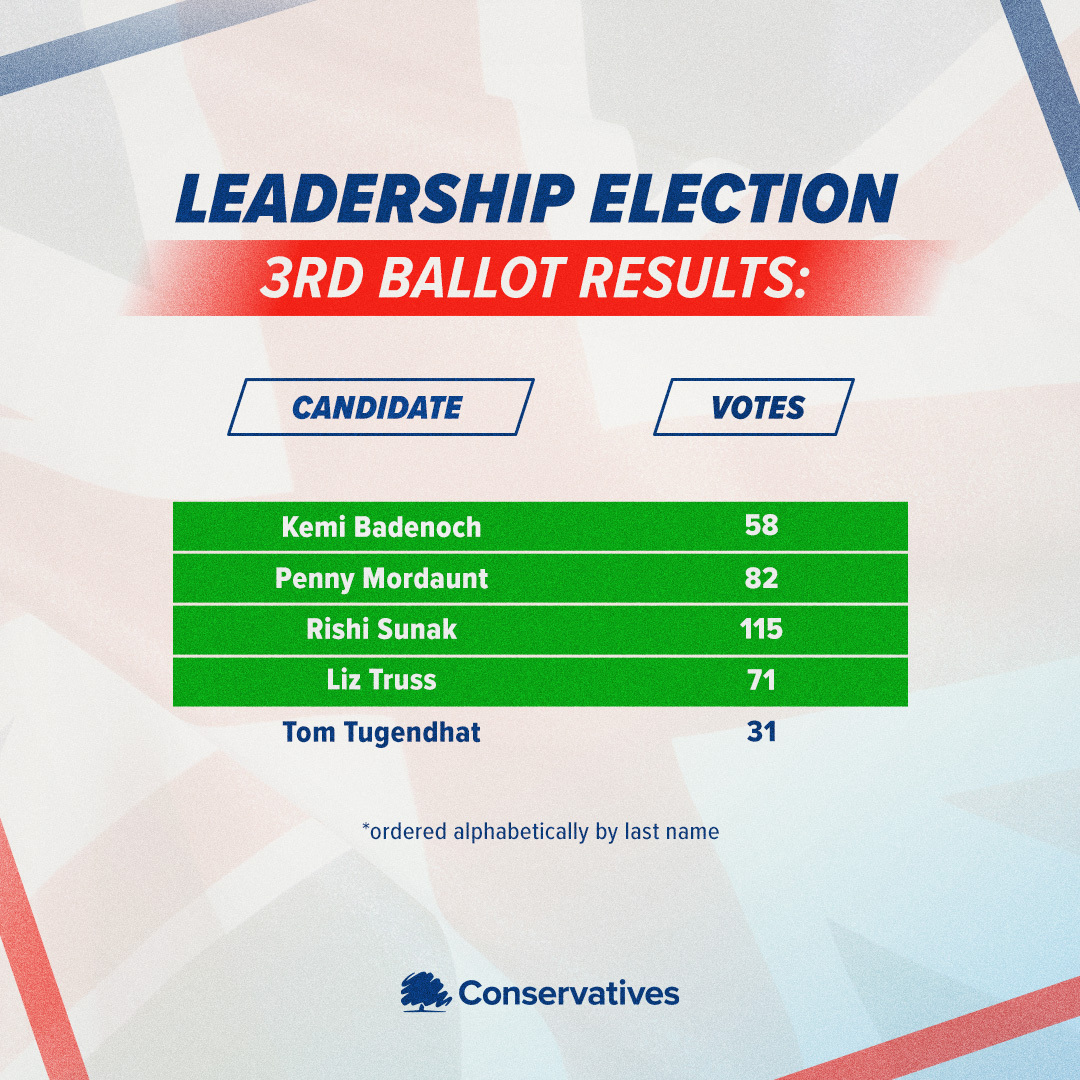 Rishi Sunak, Penny Mordaunt, Liz Truss and Kemi Badenoch now go forward to the fourth round.