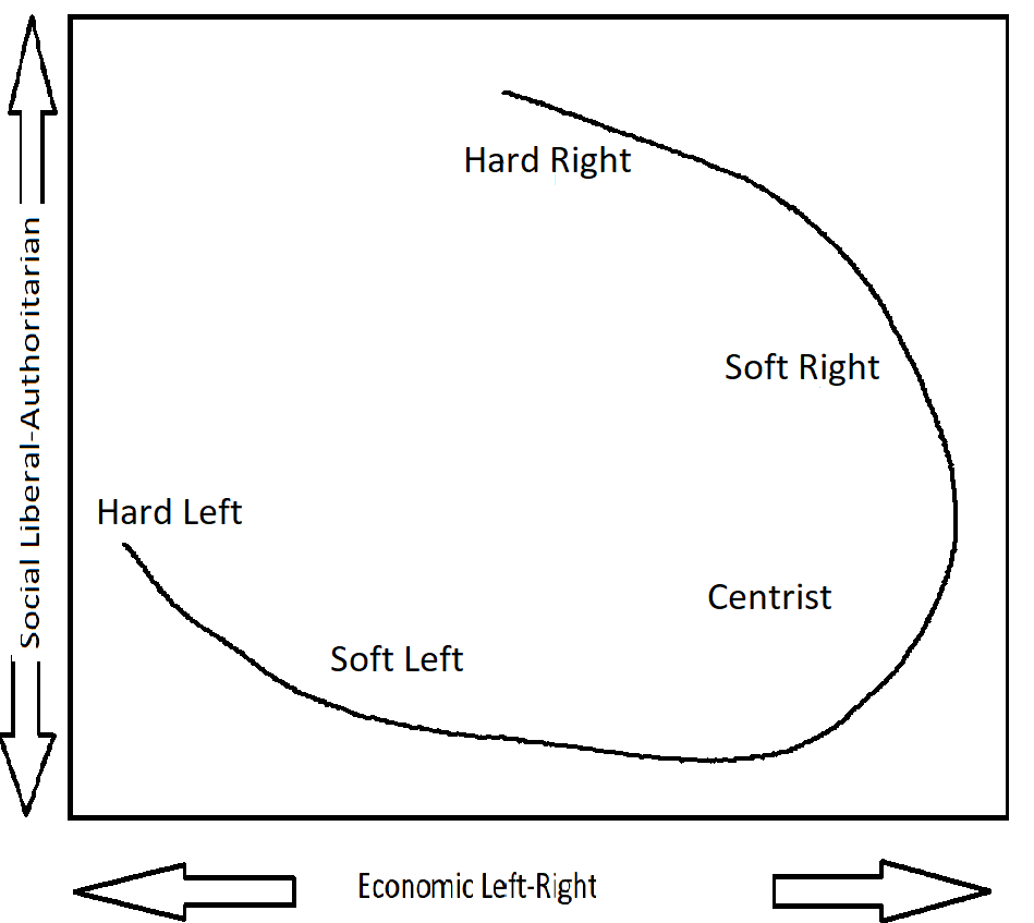 The thread suggests that UK politics a single "left-right" axis when translated into the Political Compass direction becomes a sort of "weird tilted horseshoe" in which, quote,