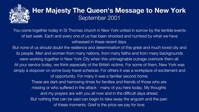 Those words are powerful even on their own with no other context, but it is perhaps worth quoting what that the full context in which they were originally written actually was. They were the concluding words of Her Majesty's message of condolences to the people of New York following the Twin Towers attacks on 9/11, twenty-one years ago on Friday.