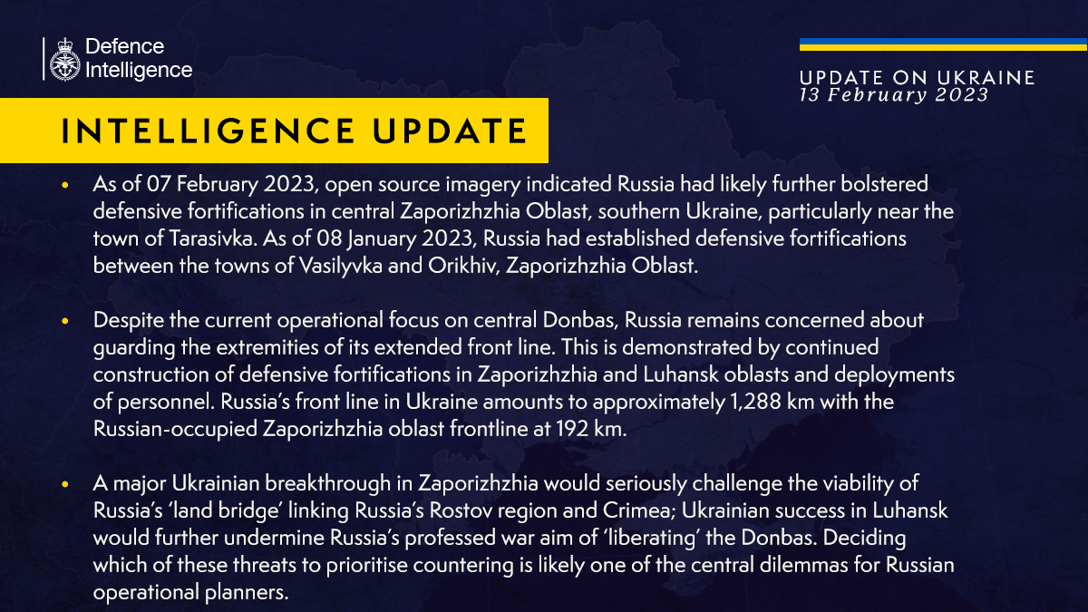Latest Defence Intelligence update on the situation in Ukraine - 13 February 2023