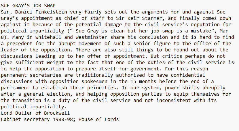 The former Cabinet Secretary, Lord Butler, has written a letter to the Times on the subject, a masterclass in presenting both sides of the case: If you read the first half of his letter you would think he appeared sympathetic to one side of the case, if you read the second half, to the other.