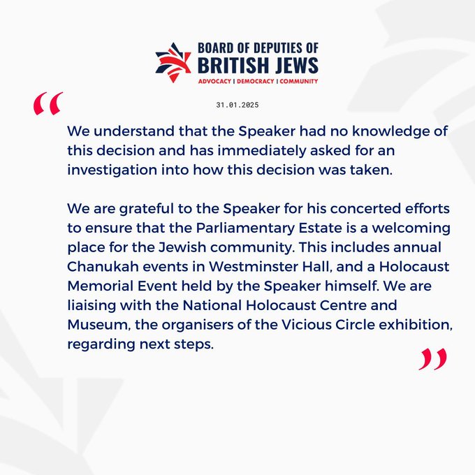 A quote from the Board of Deputies of British Jews concerning reports that a Holocaust Memorial exhibition was blocked from exhibiting in Westminster Hall.