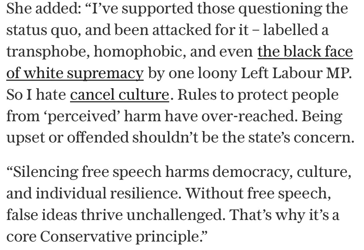 Kemi Badenoch, the Conservative leader, emphasised the need to protect Free Speech in the Telegraph and on Twitter today.