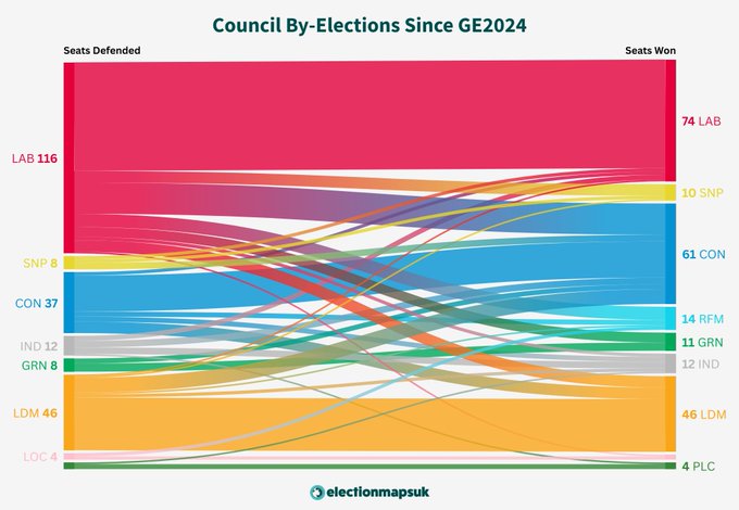 Election Maps UK have published their latest aggregate results of the 230 Council By-Elections (for 235 Seats) since the 2024 General Election: