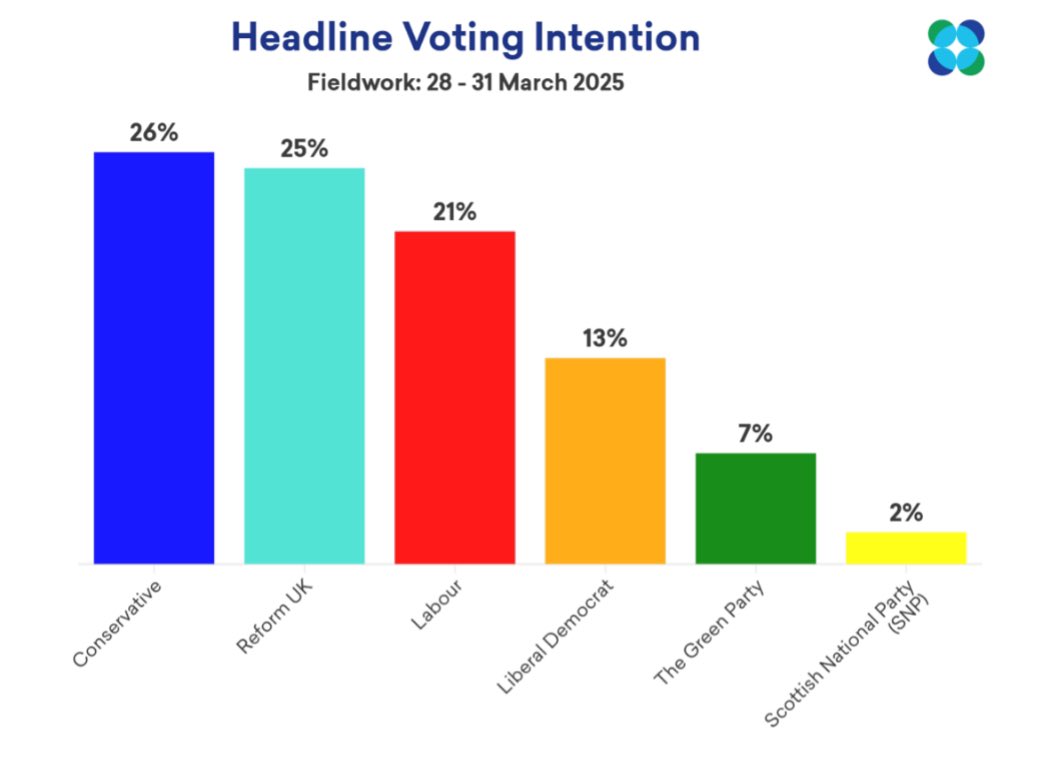 The latest More in Common Opinion poll has the Conservatives leading on 26%, Reform UK second on 25%, and Labour third on 21%.