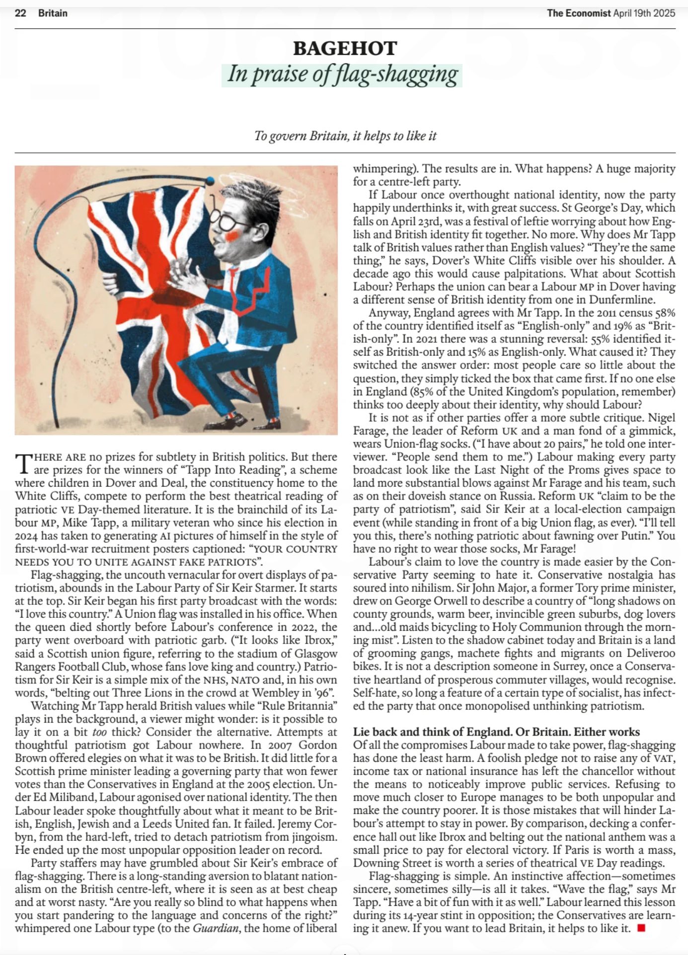 This easter the economist magazine had a Bagehot column about the political advantages of overt displays of patriotism. The Conservatives used to be masters of this - Sir Keir Starmer has so thoroughly learned and applied the lesson that Bagehot reckons he out-patrioted the Conservatives.