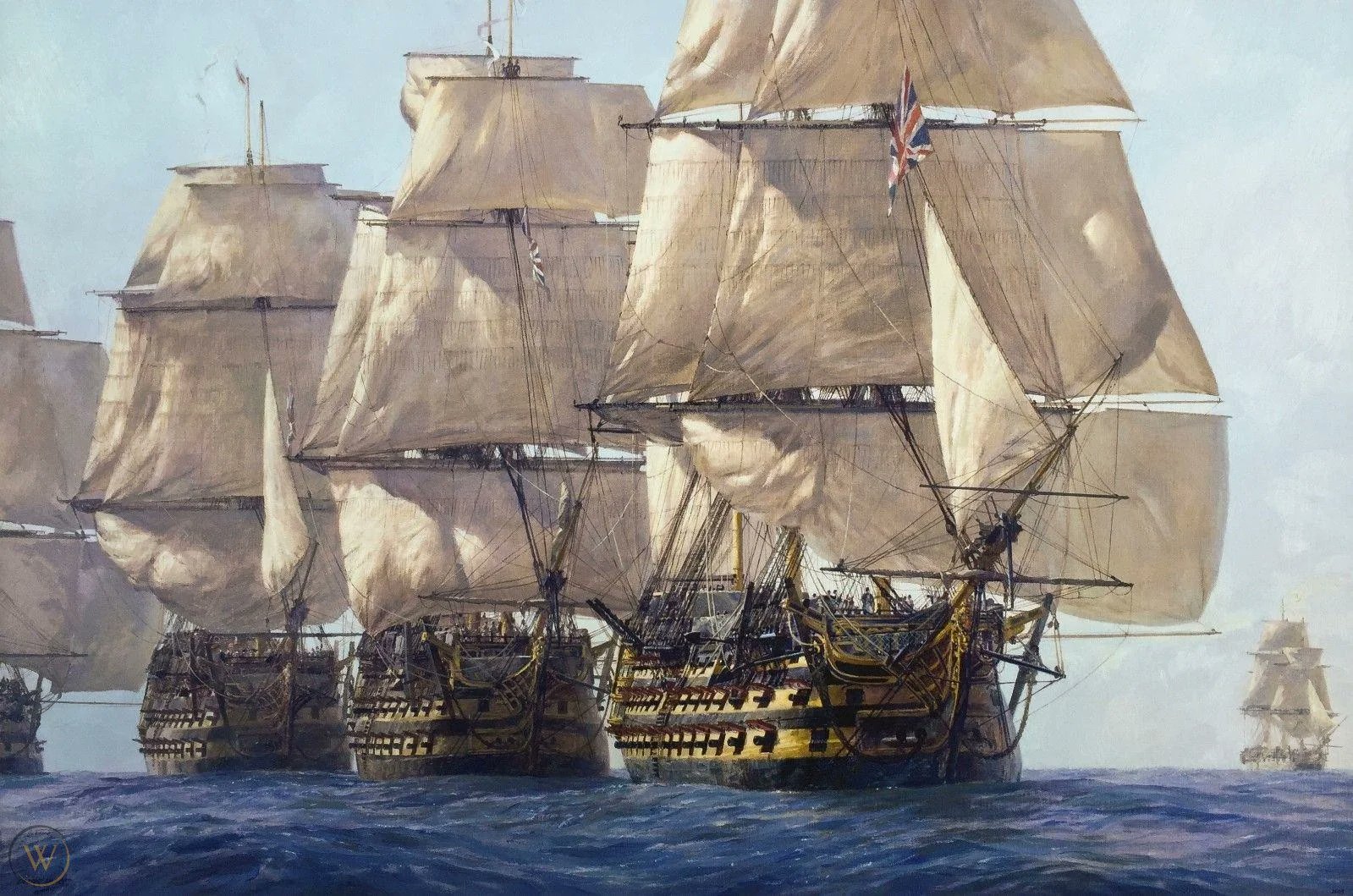 Geoff Hunt's painting of HMS Victory, HMS Temeraire and HMS Neptune leading the weather column of Nelson's fleet towards the French and Spanish combined fleet at Trafalgar, 220 years ago today (21st October 1805.)