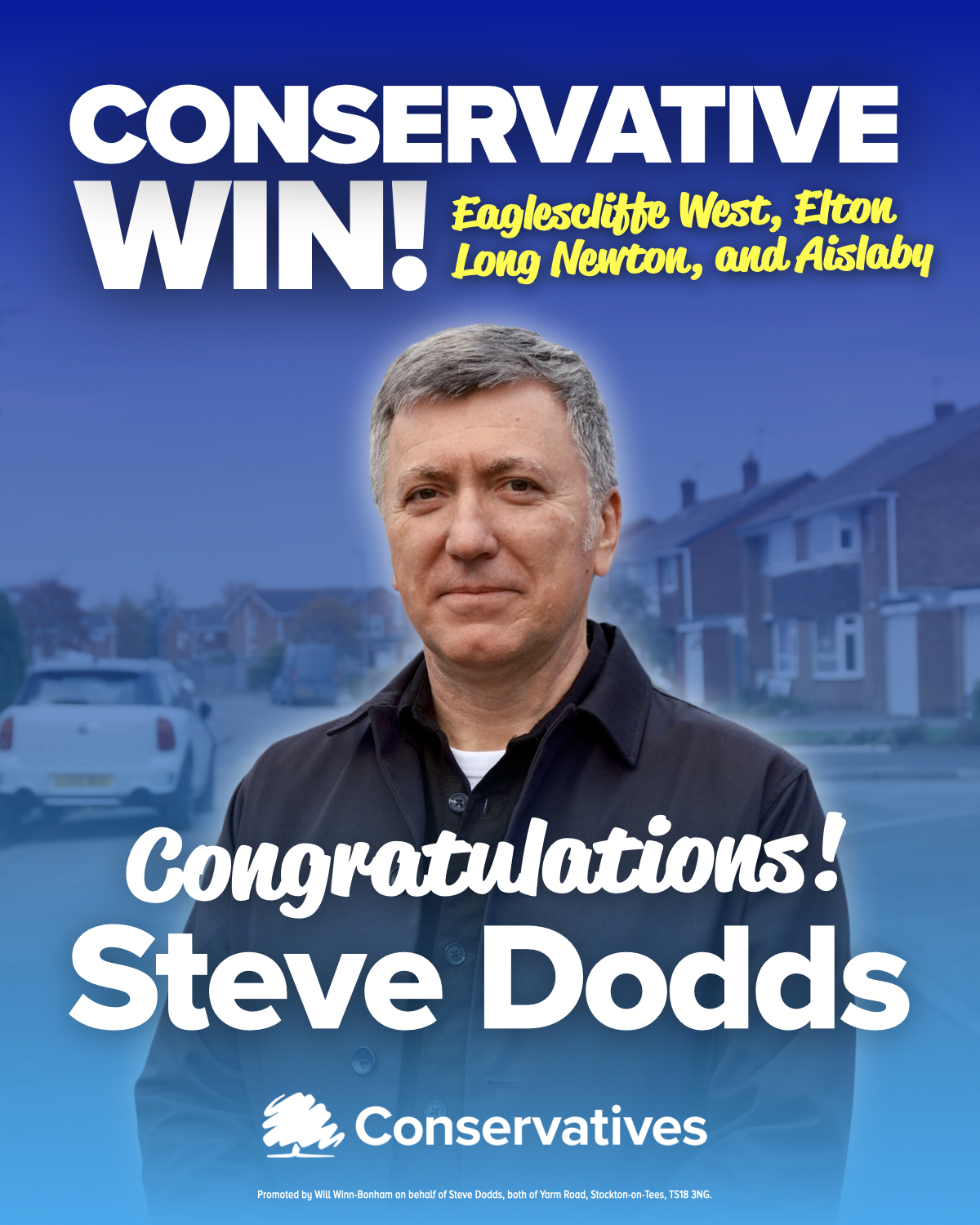 Eaglescliffe West, Elton, Long Newton and Aislaby ward (Stockton on Tees council) - congratulations to Councillor Steve Dodds who held the ward for the Conservatives yesterday with an increased vote share of over 60%.